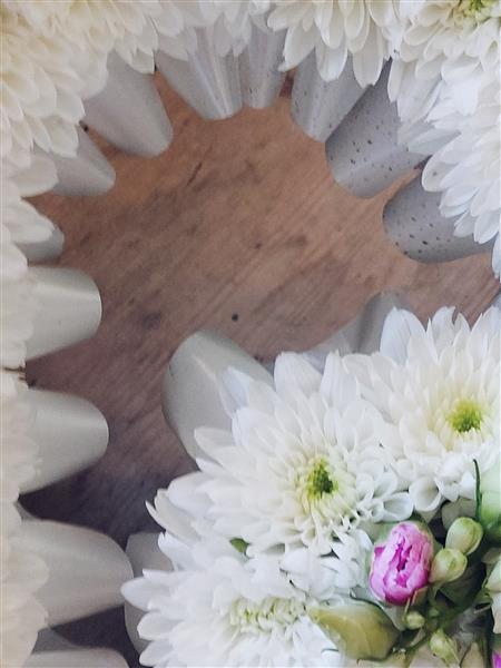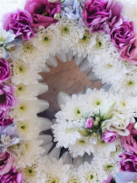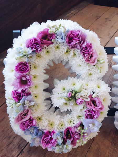Our 'combined' letter tributes are available with a white chrysanthemum base, finished with a centre of colour, along with ribbon edging to match