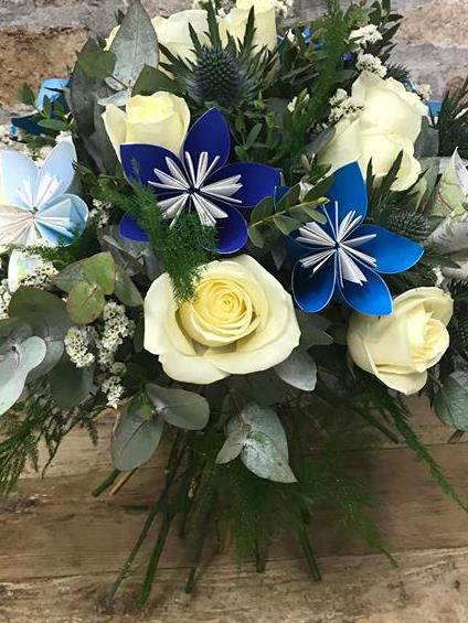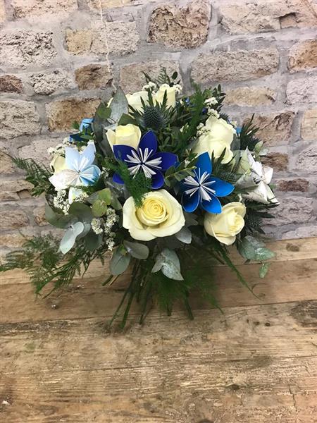 BRIDAL HAND TIE OF MIX SOFT GREENERY WITH ROSES AND THISTLE AND LIMO WITH A LITTLE PERSONAL TOUCH MADE BY BRIDE BLUE PAPER FLOWERS