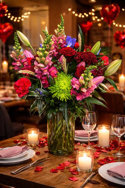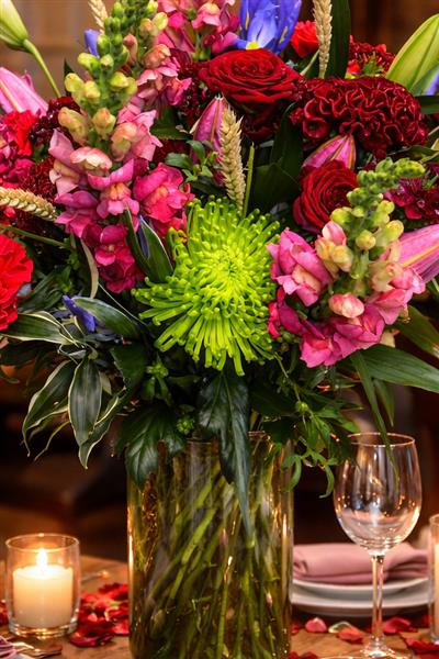EMPRESS - A sumptuous selection of Celosia, Antirrhinum, Roses, Lilies, Carnations, Chrysanthemums, and seasonal foilage. Arrives already hand tied into a vase by one of our talented florists.