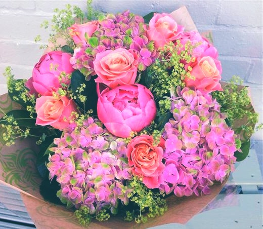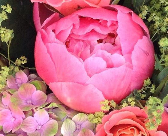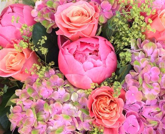PAEON - Stunning coral shades including Roses, Paeonia and Hydrangeas and seasonal foilage. Arrives hand tied by one of our talented florists to be displayed straight into a vase.