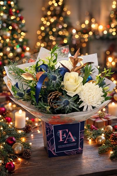 Scottish Thistle, festive pine cones, and deep evergreen foliage, this arrangement captures the spirit of a crisp Scottish winter night. Perfect for adding a touch of elegance and natural beauty to your festive table setting.