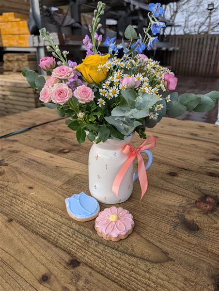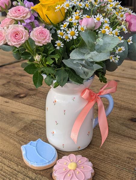 A pretty ceramic jug filled with fresh spring flowers and paired with two sweet iced biscuits — a thoughtful little gift that’s guaranteed to make her smile.