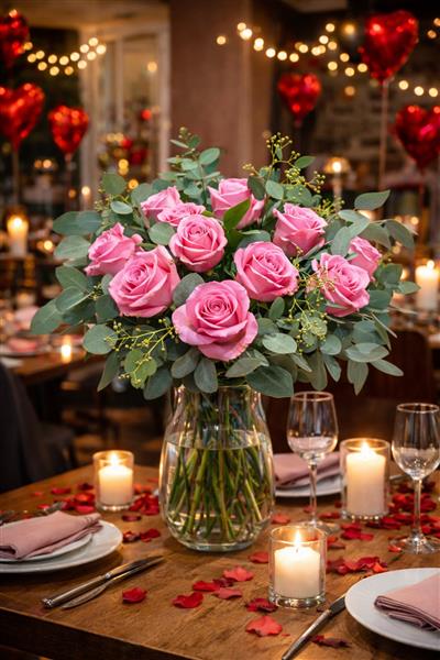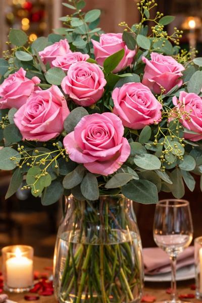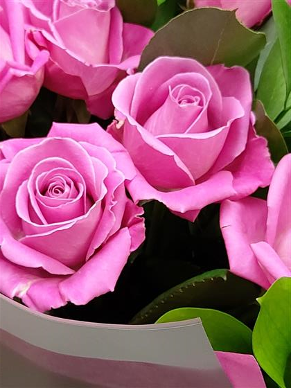 Standard size bouquet features 12 PINK! roses encased in a range of unusual foliage. A classic romantic gesture.