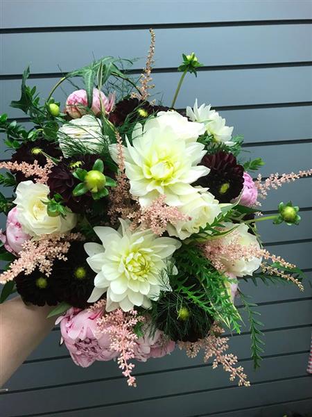 OVER SIZE BRIDAL HAND TIE OF MIX DAHLIAS, DAVID AUSTIN ROSES AND PEONIES ROSES