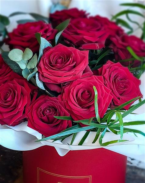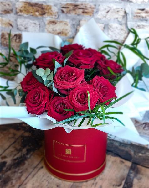 Our premium red roses displayed inside a luxury hat box.