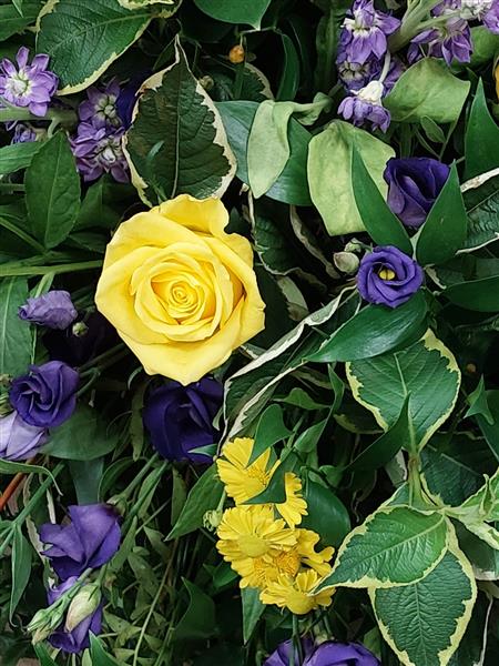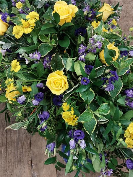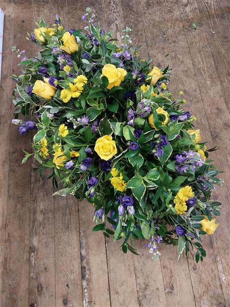 Bright yellows and purples come together to create a beatiful casket arrangement
