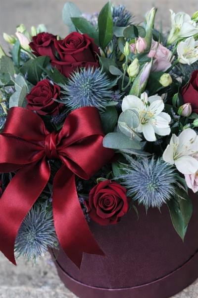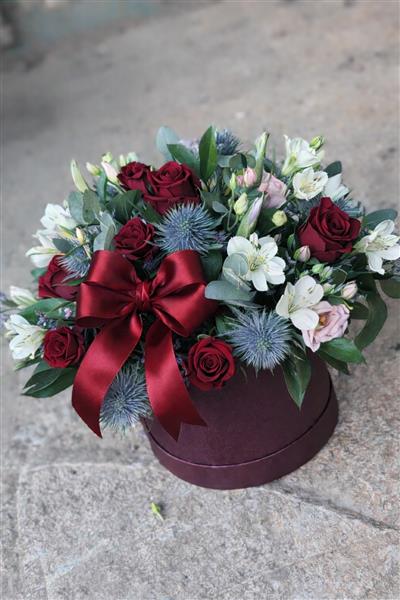 All our designs are freshly made, using the freshest, seasonal flowers. The flowers and foliage used will be similar in colour and texture to the image shown. These pictures and descriptions are therefore a reliable guide rather than an exact representation.(Colour of hatbox may vary).