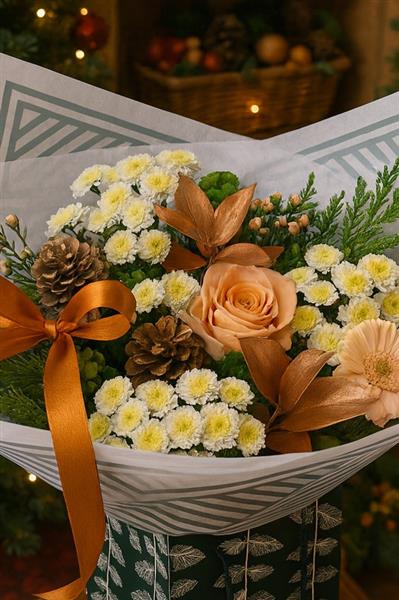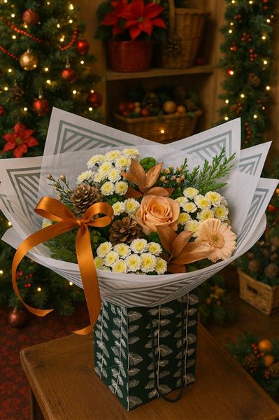 A bouquet that glows against the hush of December—peach roses and golden leaves warmed by copper ribbon, softened with snowy blooms. A seasonal flourish that speaks of light, comfort, and quiet celebration