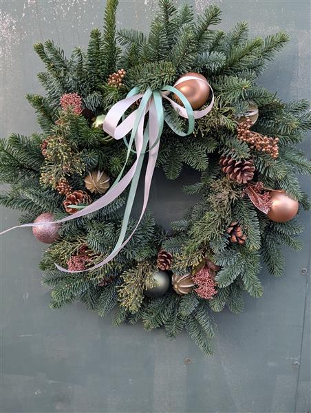 Bang on trend with sage green and bronze baubles, gold pepper berries, rose gold Skimmia, pine cones and and of course Nordman Fir.