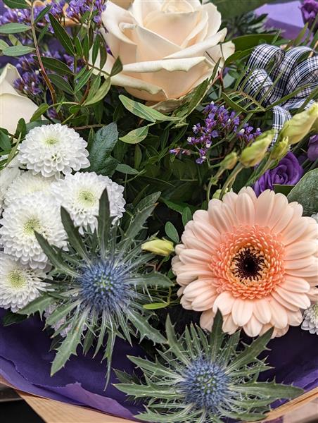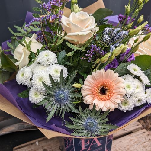 A Robert Burns inspired bouquet. Consisting of Thistle, Roses, Lisianthus ( please not where lisianthus isn't available we will replace with a similar flower) & Germini, and finished off with a flash of tartan ribbon. Image shown is medium.