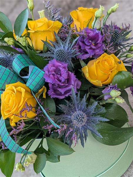 All our designs are freshly made, using the freshest, seasonal flowers. The flowers and foliage used will be similar in colour and texture to the image shown. These pictures and descriptions are therefore a reliable guide rather than an exact representation.(Colour of hatbox may vary).